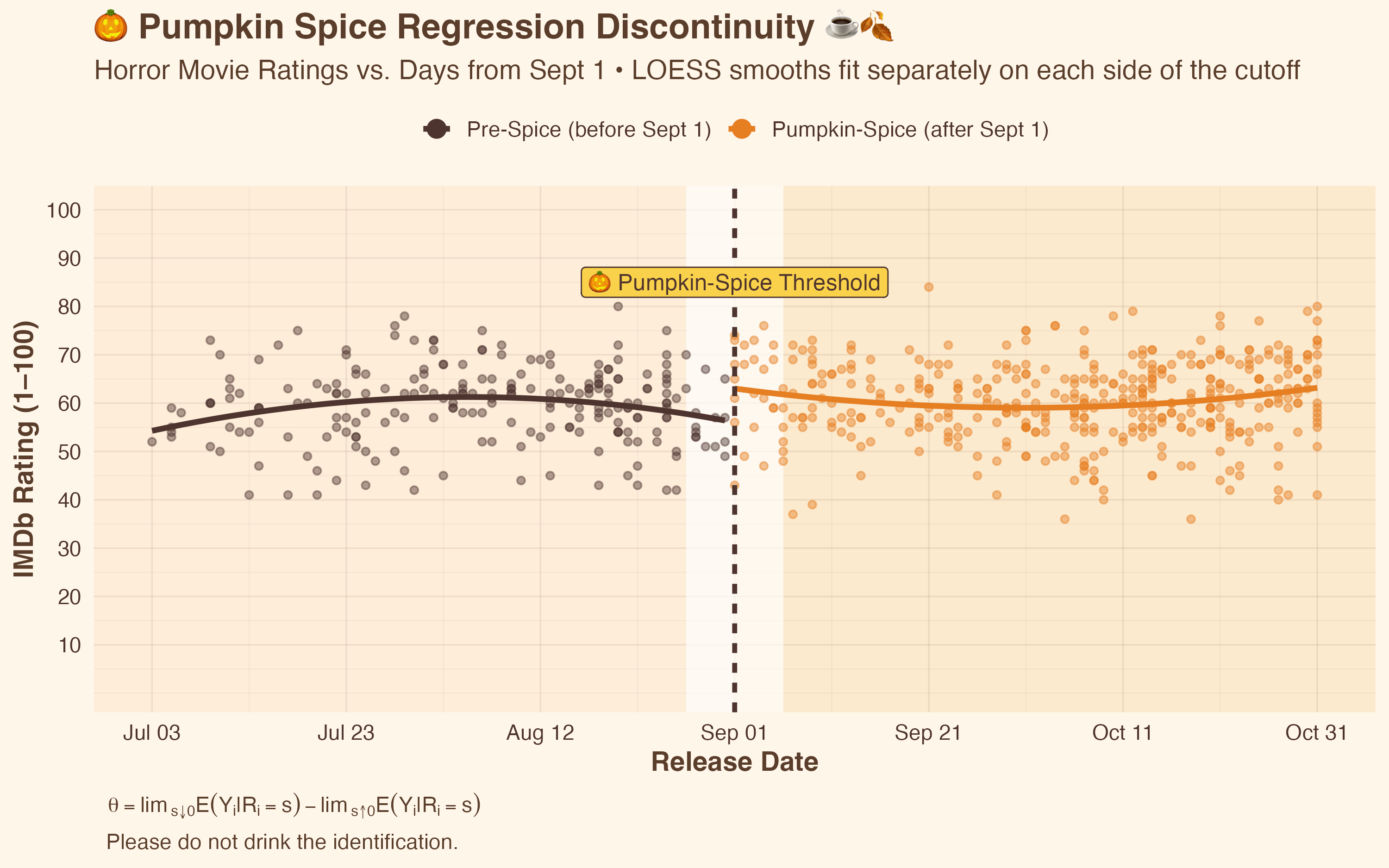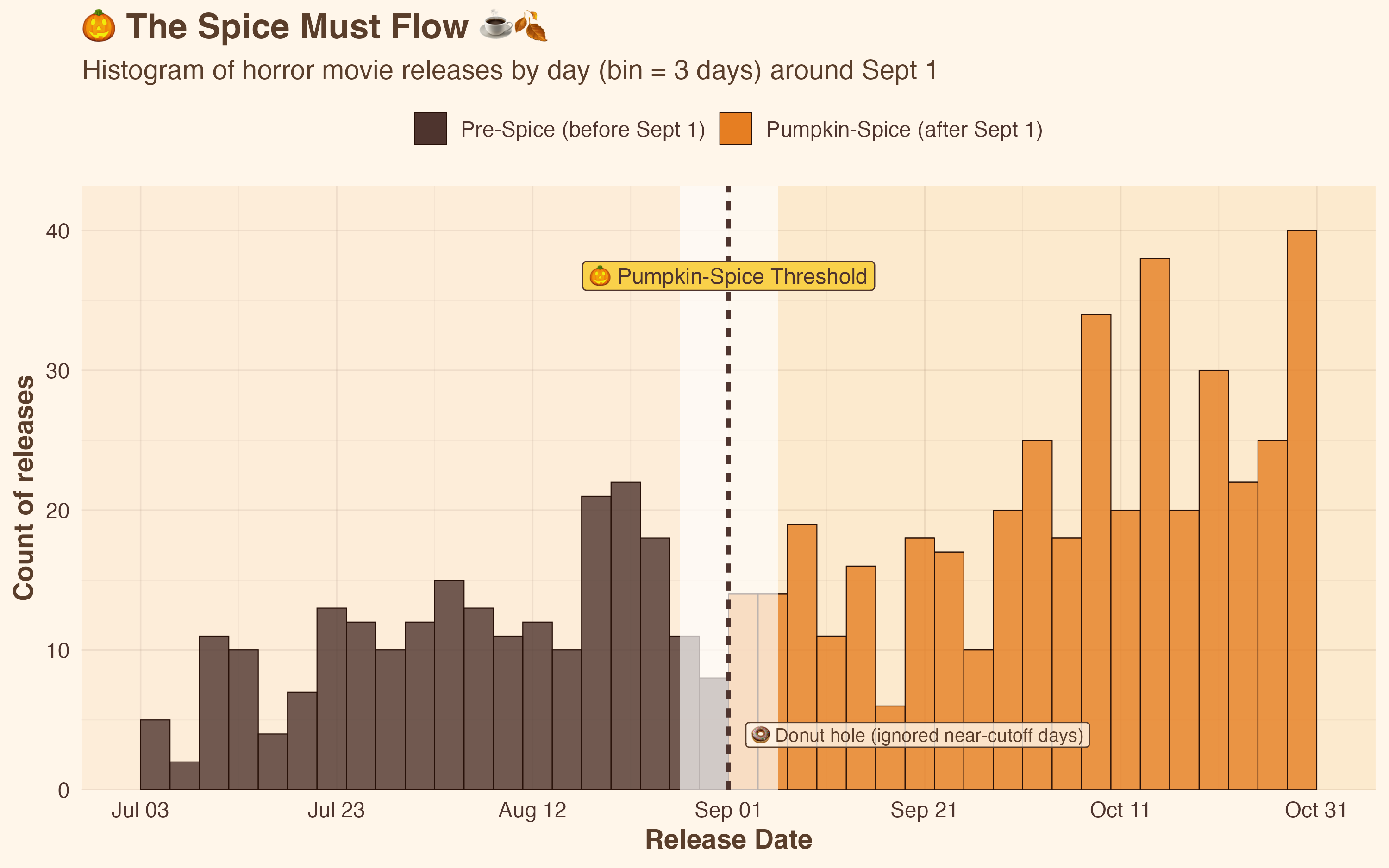 Entering into Pumpkin Spice Season on September 1st has a causal boost of 6.7 pts on horror movie ratings (\(p \leq 0.05\)).